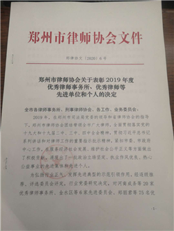 煥廷新聞|熱烈祝賀煥廷法律服務團隊梁靜飛同志榮獲鄭州市“2019年度優秀律師”