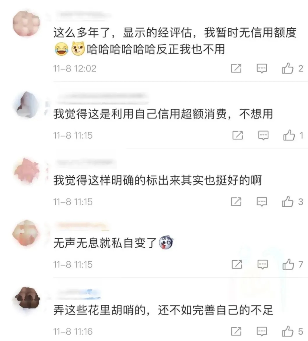 從部分網友曬出的信息看,其借款服務調整到“信用貸”頁面展示后,借款額度、利率沒有發生變化。